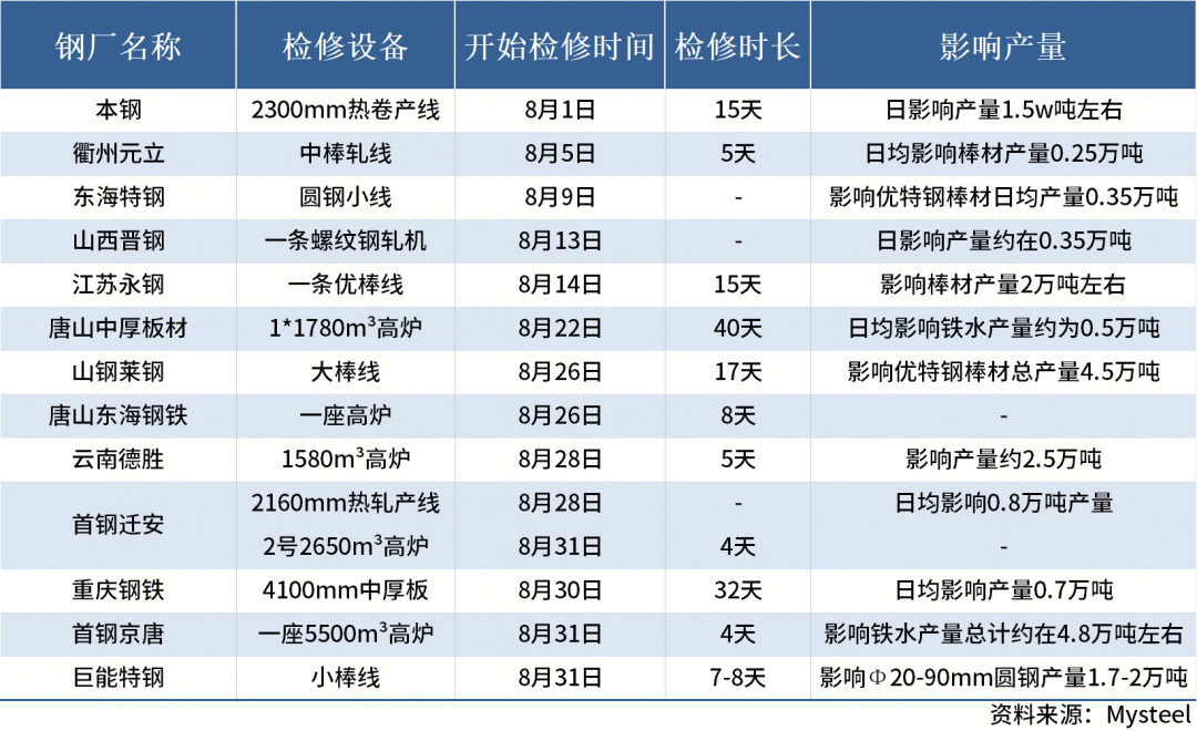 據(jù)Mysteel不完全統(tǒng)計,8月以來國內(nèi)13家鋼廠發(fā)布檢修信息,其中,首鋼京唐計劃于8月31日對一座5500m3高爐進(jìn)行檢修至9月3日結(jié)束,為期4天左右,影響鐵水產(chǎn)量總計約在4.8萬噸左右。具體情況如下: