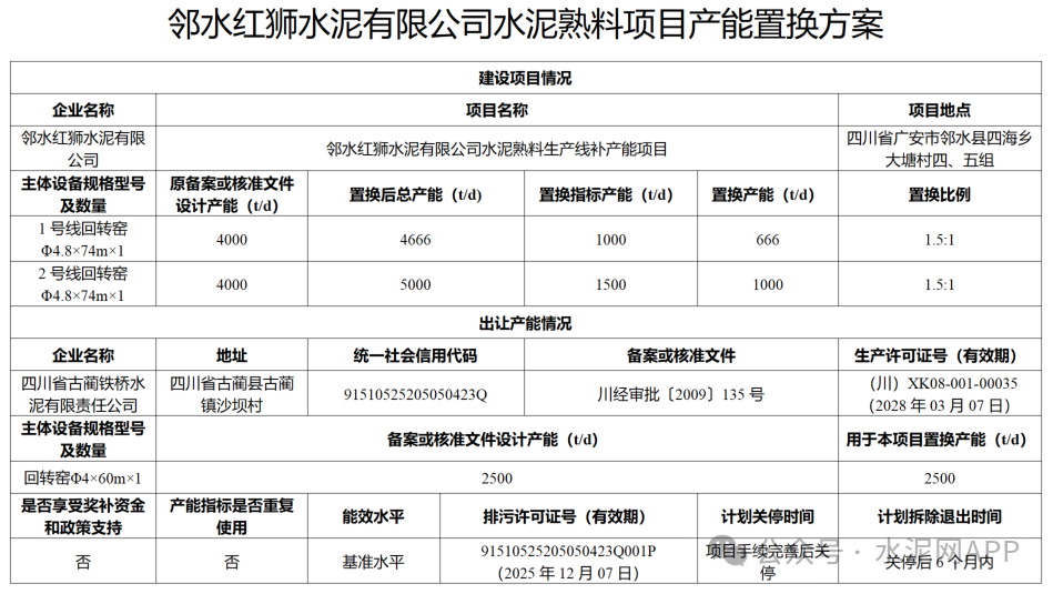 公示顯示,鄰水紅獅水泥1#4000t/d熟料線補充產能666t/d,補充后產能為4666t/d,2#4000t/d熟料線補充產能1000t/d,補充后產能為5000t/d,出讓產能來自四川省古藺鐵橋水泥有限責任公司一條2500t/d熟料線,置換比例1.5:1。