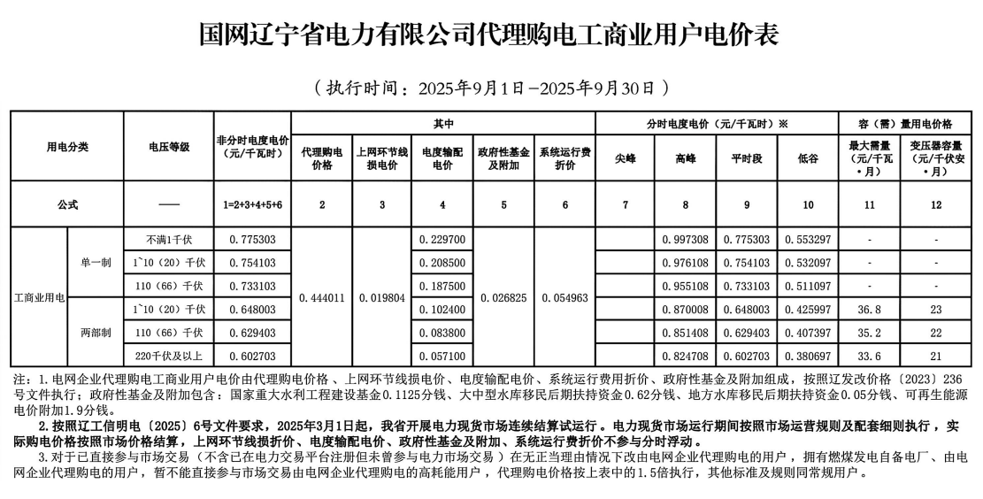 國(guó)網(wǎng)遼寧省電力有限公司代理購(gòu)電工商業(yè)用戶電價(jià)表(2025年9月)