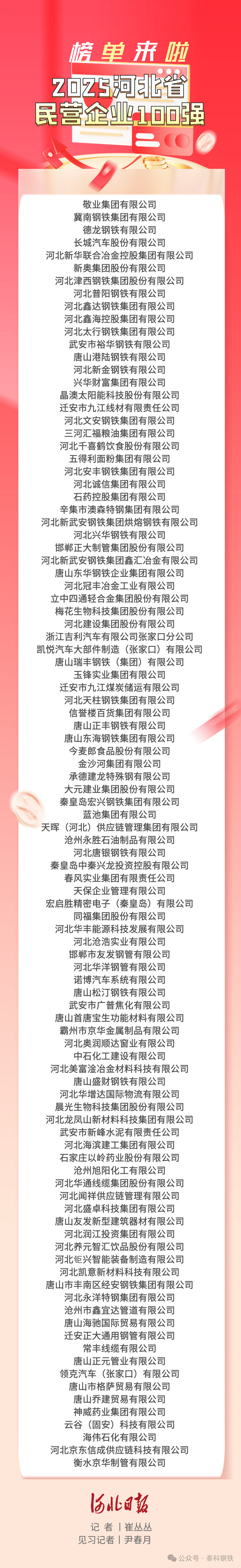 9月9日,河北省工商聯(lián)在滄州舉行2025年河北省民營(yíng)企業(yè)100強(qiáng)發(fā)布會(huì),發(fā)布2025河北省民營(yíng)企業(yè)100強(qiáng)榜單。敬業(yè)集團(tuán)、冀南鋼鐵集團(tuán)、德龍鋼鐵包攬前三,新華聯(lián)合冶金、津西鋼鐵、普陽(yáng)鋼鐵、鑫達(dá)鋼鐵進(jìn)前十!具體名單如下↓↓↓