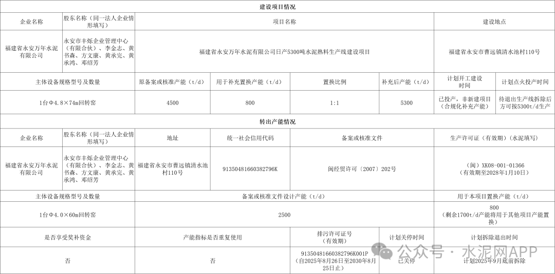置換方案顯示,福建省永安萬(wàn)年水泥一條4500t/d熟料線補(bǔ)充產(chǎn)能800t/d,補(bǔ)充后產(chǎn)能為5300t/d,退出產(chǎn)能來(lái)自同企業(yè)一條2500t/d熟料線(800t/d用于該項(xiàng)目,剩余1700t/d用于其他項(xiàng)目)。