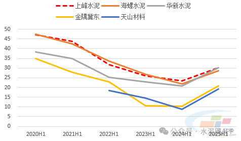 盡管水泥熟料綜合銷量出現(xiàn)下降,但得益于煤炭采購價格下跌和精細(xì)化管理促使可控成本下降,2025年上半年公司水泥熟料綜合毛利率達(dá)到30.1%,較去年同期提升6.7個百分點(diǎn),絕對毛利率水平略微低于華新水泥(主要海外帶動),超過國內(nèi)多數(shù)主要上市公司,在行業(yè)中處于領(lǐng)先地位,水泥產(chǎn)品盈利能力較強(qiáng)。