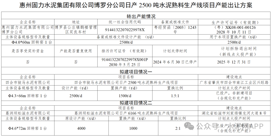 產能置換方案顯示,惠州固力水泥集團有限公司博羅分公司轉出一條2500t/d熟料產能,其中1500t/d產能用于補充四會市駿馬水泥生產線,1000t/d產能用于補充葛洲壩松滋水泥生產線。