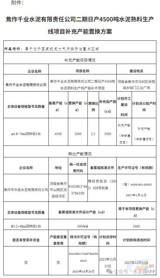 近日,河南省焦作市馬村區(qū)人民政府網(wǎng)站發(fā)布了關(guān)于焦作千業(yè)水泥有限責(zé)任公司二期日產(chǎn)4500噸水泥熟料生產(chǎn)線項(xiàng)目補(bǔ)充產(chǎn)能置換方案的公示。公示期:2025年9月17日至2025年9月23日(5個(gè)工作日)。