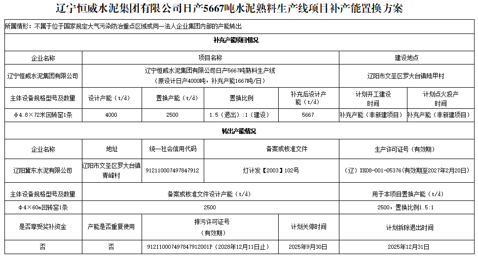 按照工業(yè)和信息化部《水泥玻璃行業(yè)產(chǎn)能置換實施辦法》(工信部原〔2024〕206號)有關(guān)規(guī)定及水泥行業(yè)產(chǎn)能管理相關(guān)政策要求,我廳于2025年9月9日至9月22日對遼寧恒威水泥集團有限公司日產(chǎn)5667噸水泥熟料生產(chǎn)線項目補充產(chǎn)能置換方案進行了公示,公示期間未收到異議,現(xiàn)予通告。