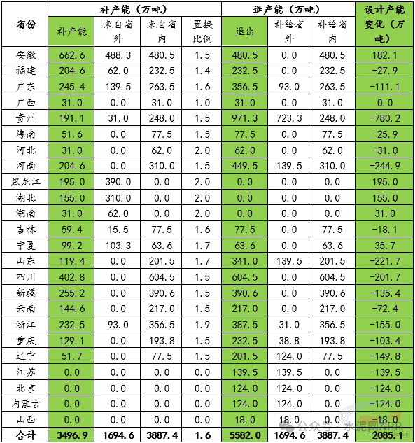 據(jù)中國水泥網(wǎng)水泥大數(shù)據(jù)研究院統(tǒng)計,截至當(dāng)前,補(bǔ)產(chǎn)能公示項目僅100余例,累計補(bǔ)充產(chǎn)能3496.9萬噸,退出5582萬噸,凈減2085.1萬噸,凈減產(chǎn)能數(shù)量遠(yuǎn)少于需求下滑數(shù)量,供需矛盾放大,政策效果較差。