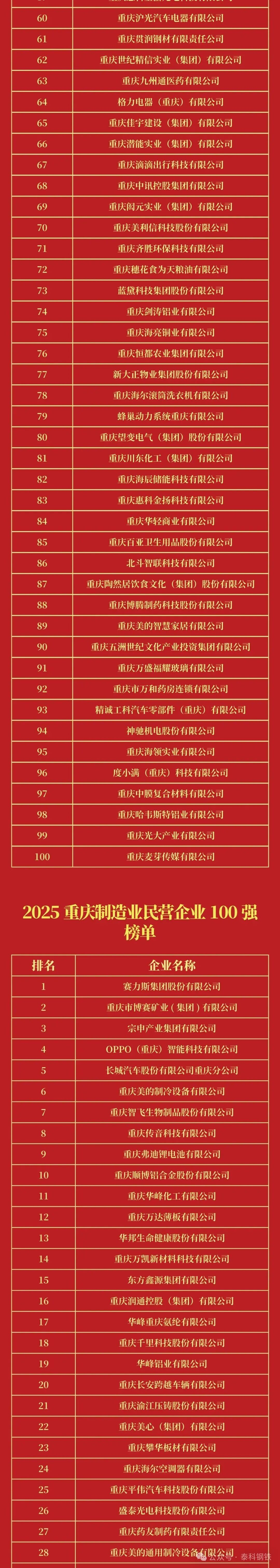 9月19日,重慶市工商聯(lián)、市發(fā)改委、市經(jīng)信委舉辦“2025重慶民營(yíng)企業(yè)100強(qiáng)發(fā)布會(huì)”會(huì)上,2025重慶民營(yíng)企業(yè)100強(qiáng)和2025重慶制造業(yè)民營(yíng)企業(yè)100強(qiáng)榜單正式發(fā)布。鋼鐵、冶金行業(yè),賽博礦業(yè)、萬(wàn)達(dá)薄板、攀華板材等上榜民營(yíng)企業(yè)100強(qiáng),足航釩鈦鋼鐵、永航鋼鐵集團(tuán)等上榜制造業(yè)民營(yíng)企業(yè)100。