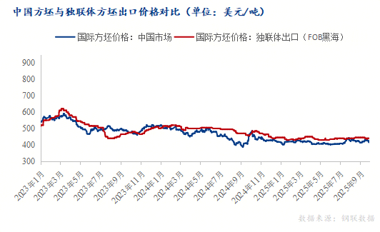 圖一:2023-2025年中國鋼坯與獨(dú)聯(lián)體方坯出口價(jià)格對(duì)比