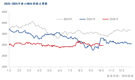 圖二:2023-2025年唐山鋼坯價(jià)格走勢(shì)圖