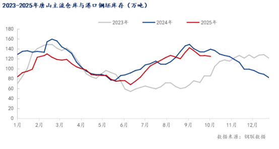 圖七:2023-2025年唐山主流倉庫與鋼坯庫存