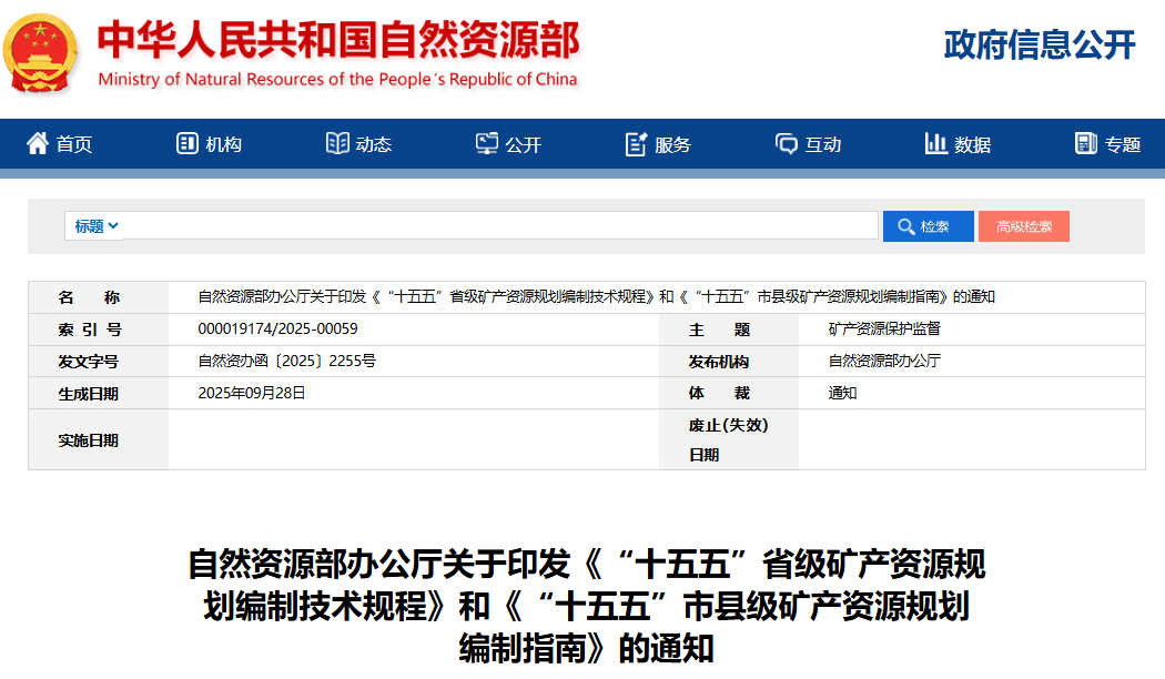 為加強部省銜接,指導做好省市縣各級礦產資源規(guī)劃工作,依據《礦產資源法》和《礦產資源規(guī)劃編制實施辦法》,按照《自然資源部辦公廳關于開展“十四五”礦產資源規(guī)劃總結評估及“十五五”規(guī)劃編制工作的通知》(自然資辦發(fā)〔2025〕19號)要求,部研究制定了《“十五五”省級礦產資源規(guī)劃編制技術規(guī)程》和《“十五五”市縣級礦產資源規(guī)劃編制指南》,現印發(fā)給你們,請參照執(zhí)行。
