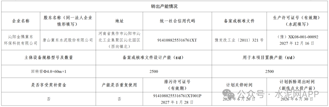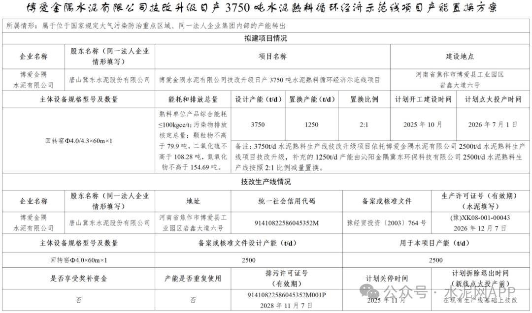 置換方案顯示,博愛(ài)金隅3750t/d水泥熟料生產(chǎn)線(xiàn)技改升級(jí)項(xiàng)目依托博愛(ài)金隅水泥有限公司2500t/d水泥熟料生產(chǎn)線(xiàn)項(xiàng)目技改升級(jí),補(bǔ)充的1250t/d產(chǎn)能由沁陽(yáng)金隅冀東環(huán)??萍加邢薰?500t/d水泥熟料生產(chǎn)線(xiàn)按照2:1比例減量置換。