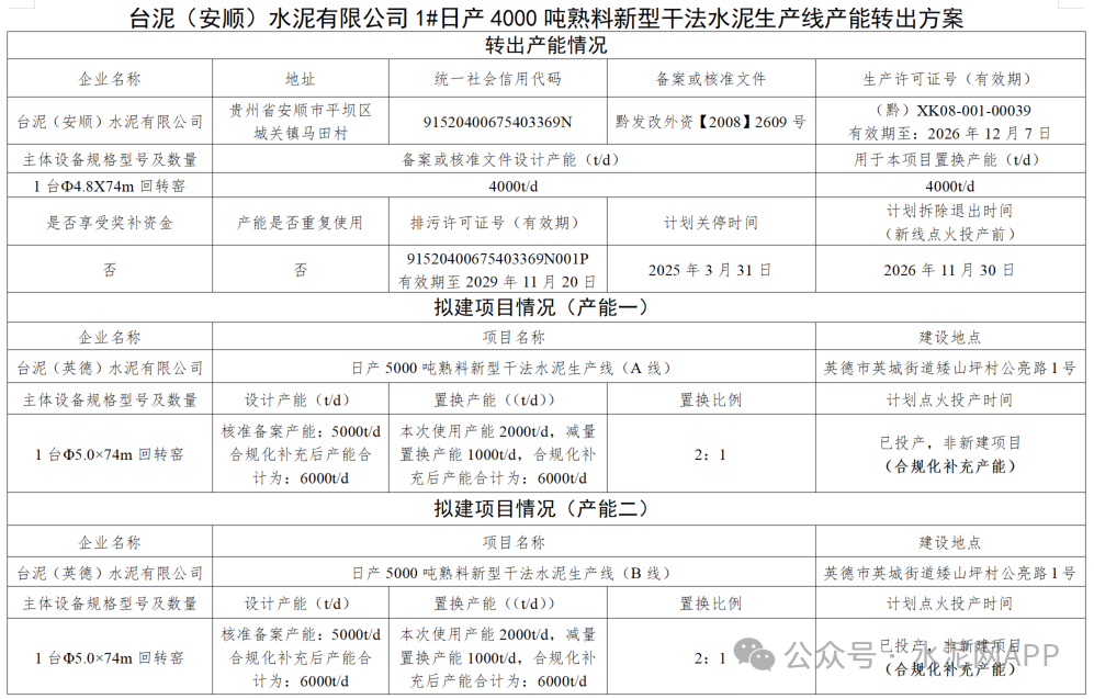 置換方案顯示,臺(tái)泥(安順)轉(zhuǎn)出一條4000t/d熟料生產(chǎn)線產(chǎn)能,分別用于補(bǔ)充臺(tái)泥(英德)兩條5000t/d熟料生產(chǎn)線,補(bǔ)充完成后,生產(chǎn)線產(chǎn)能為6000t/d,置換比例2:1。