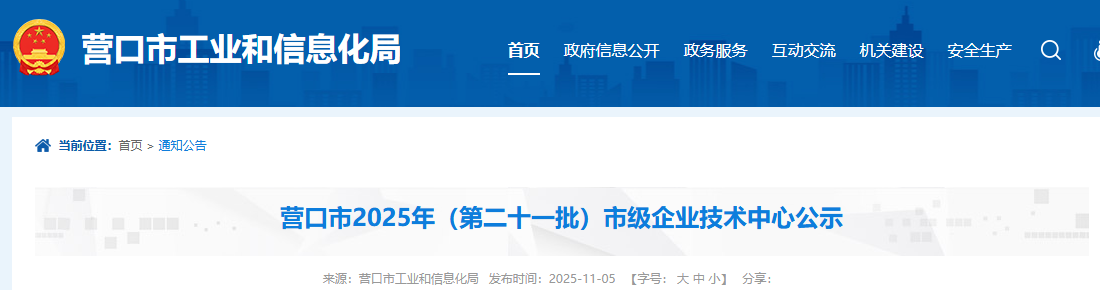 現(xiàn)將擬認(rèn)定的2025年(第二十一批)營口市市級(jí)企業(yè)技術(shù)中心名單(附件)予以公示,公示期為11月5日-11月11日,如有意見,請(qǐng)將意見以書面(實(shí)名)形式,反饋營口市工業(yè)和信息化局科學(xué)技術(shù)科。