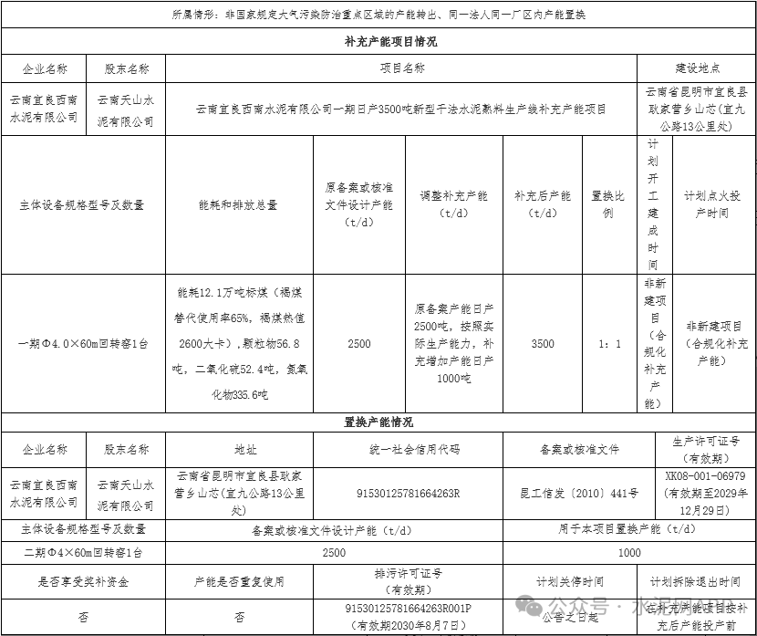 置換方案顯示,云南宜良西南水泥2500t/d熟料生產(chǎn)線補(bǔ)充產(chǎn)能1000t/d,補(bǔ)充后產(chǎn)能3500t/d,退出產(chǎn)能來自同公司一條2500t/d熟料線(用于本項(xiàng)目1000t/d),置換比例1:1。