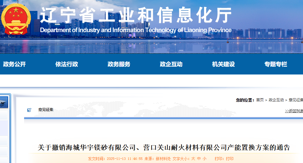 關(guān)于撤銷海城華宇鎂砂有限公司、營口關(guān)山耐火材料有限公司產(chǎn)能置換方案的通告2025年6月19日、10月10日,我廳分別對海城華宇鎂砂有限公司、營口關(guān)山耐火材料有限公司新建輕燒氧化鎂項(xiàng)目產(chǎn)能置換方案進(jìn)行了通告。