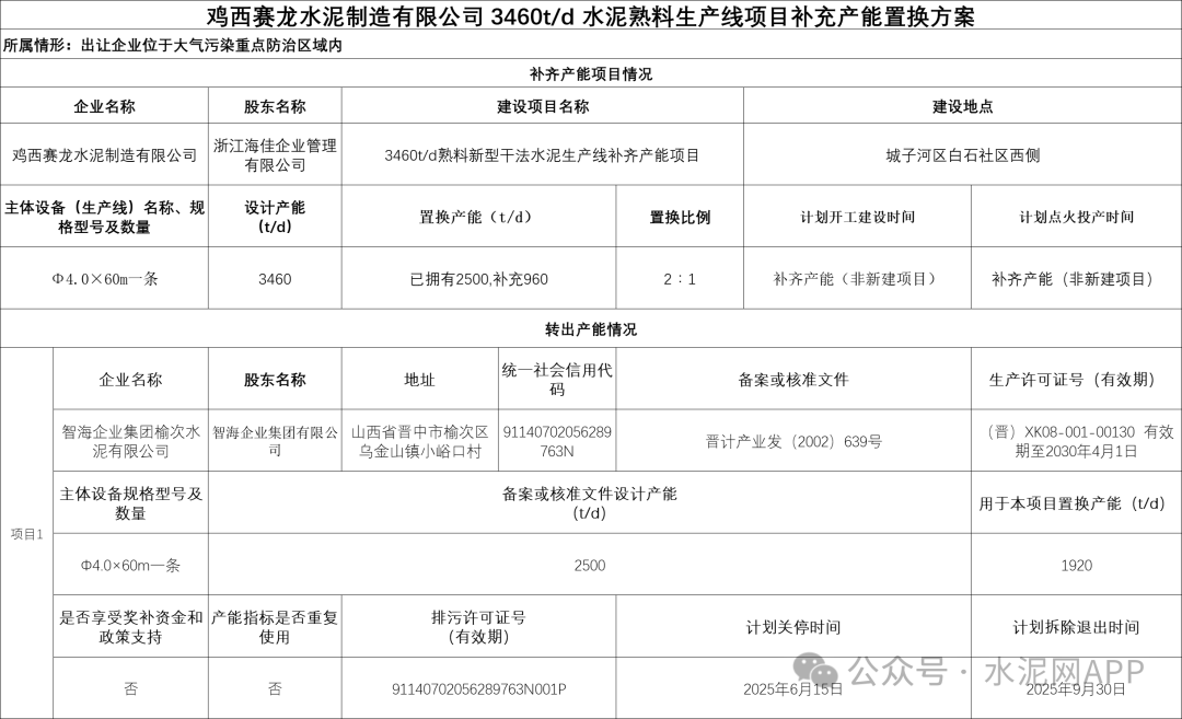 置換方案顯示,雞西賽龍水泥制造有限公司一條2500t/d熟料生產(chǎn)線補充產(chǎn)能960t/d,補充后產(chǎn)能3460t/d,退出產(chǎn)能來自智海企業(yè)集團榆次水泥有限公司一條2500t/d熟料線(用于本項目1920t/d),置換比例2:1。