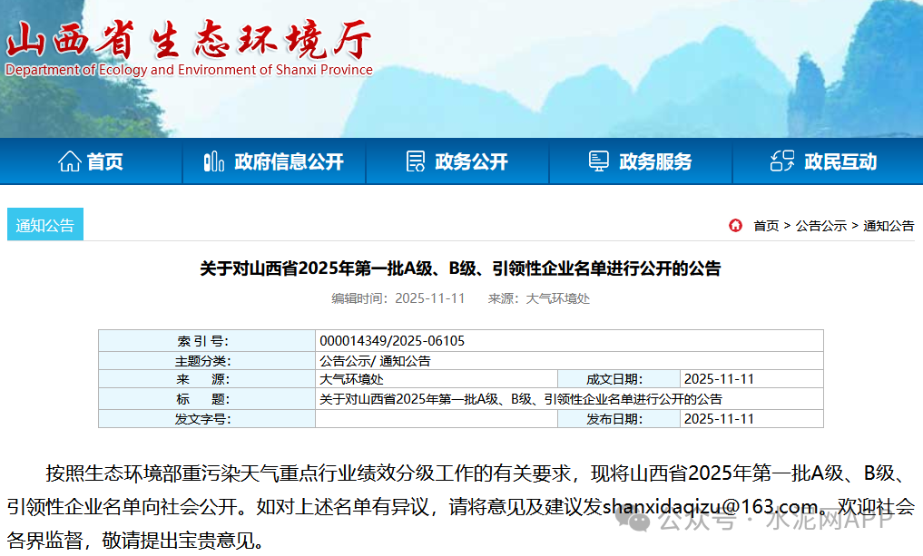 11月11日,山西省生態(tài)環(huán)境廳發(fā)布關(guān)于對(duì)山西省2025年第一批A級(jí)、B級(jí)、引領(lǐng)性企業(yè)名單進(jìn)行公開的公告。