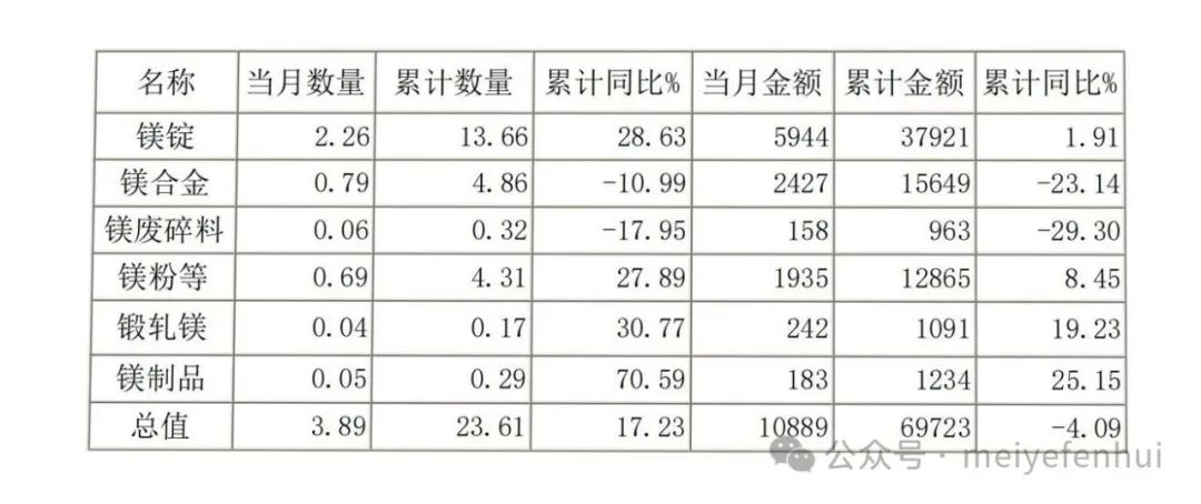 1-6月中國共出口各類鎂產(chǎn)品23.61萬噸,同比增長17.23%;累計金額約6.97億美元,同比下降4.09%。其中鎂錠共出口13.66萬噸,同比增長28.63%;鎂合金共出口4.86萬噸,同比下降10.99%;鎂粉共出口4.31萬噸,同比上漲27.89%。