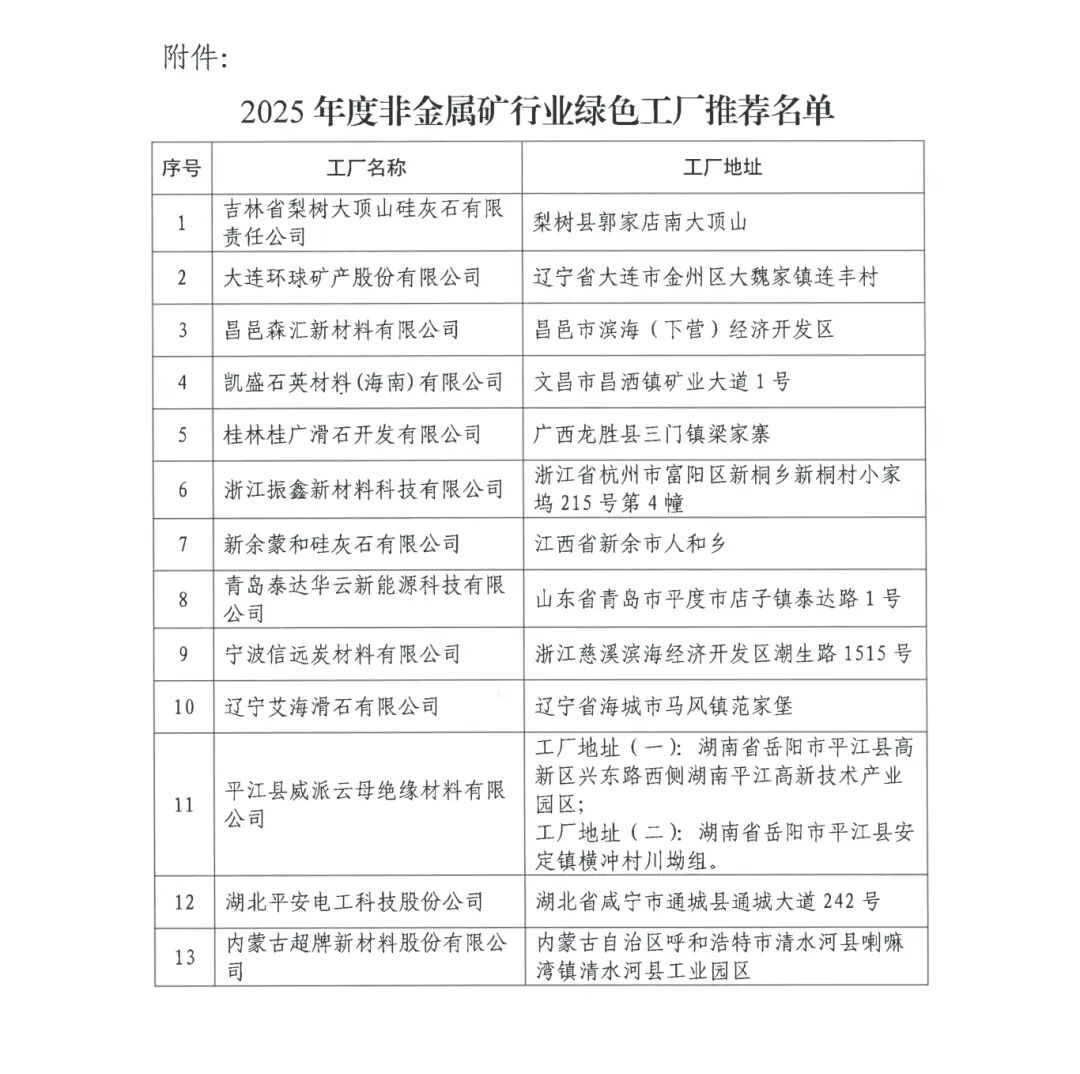 2025年度非金屬礦行業(yè)綠色工廠評審結果公示