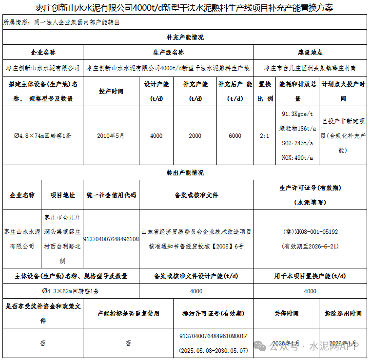 置換方案顯示,棗莊創(chuàng)新山水水泥4000t/d熟料生產(chǎn)線補充產(chǎn)能2000t/d,補充后產(chǎn)能6000t/d,退出產(chǎn)能來自棗莊山水水泥4000t/d熟料生產(chǎn)線,置換比例2:1。