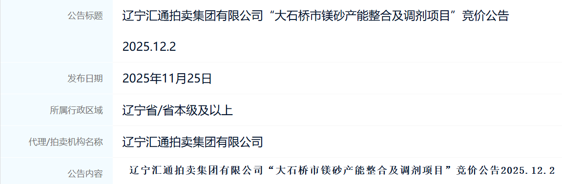 為貫徹落實(shí)大石橋市菱鎂產(chǎn)業(yè)結(jié)構(gòu)調(diào)整與轉(zhuǎn)型升級的戰(zhàn)略部署,優(yōu)化資源配置,實(shí)現(xiàn)高質(zhì)量發(fā)展。根據(jù)大石橋市鎂砂產(chǎn)能整合及調(diào)劑工作的總體安排,大石橋市政府責(zé)成大石橋市工業(yè)和信息化局委托遼寧匯通拍賣集團(tuán)有限公司,就已列入大石橋市850萬噸壓減目標(biāo)以及完成產(chǎn)能整合且已在大石橋市工業(yè)和信息化局報(bào)備的整合方企業(yè),擬于2025年12月2日組織公開競價(jià)活動,以確定產(chǎn)能整合及調(diào)劑的受讓方及補(bǔ)償金額。