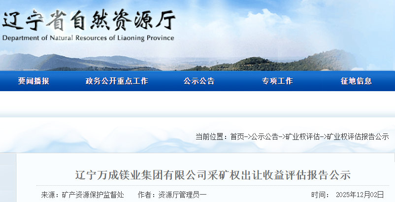 遼寧萬(wàn)成鎂業(yè)集團(tuán)有限公司采礦權(quán)出讓收益評(píng)估報(bào)告通過(guò)遼寧省自然資源廳門戶網(wǎng)站向社會(huì)公示,公示10個(gè)工作日。如有異議,請(qǐng)于公示之日起10個(gè)工作日內(nèi)以電話方式先向省自然資源廳礦產(chǎn)資源保護(hù)監(jiān)督處提出簡(jiǎn)要意見,隨后及時(shí)將書面意見反饋到省自然資源廳礦產(chǎn)資源保護(hù)監(jiān)督處。