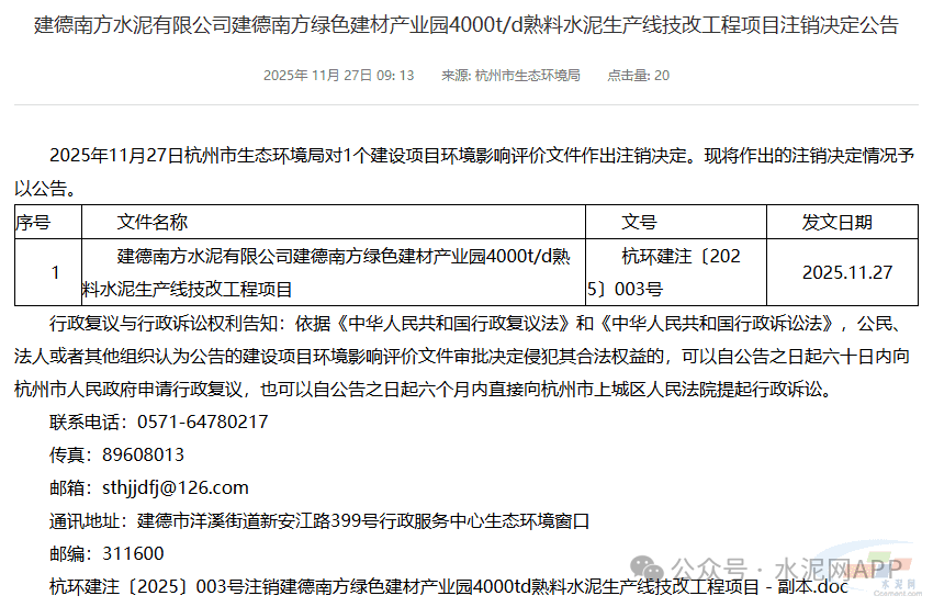 11月27日,浙江省杭州市生態(tài)環(huán)境局發(fā)布關于建德南方水泥有限公司建德南方綠色建材產(chǎn)業(yè)園4000t/d熟料水泥生產(chǎn)線技改工程項目注銷決定公告。