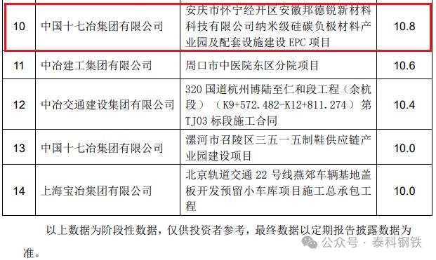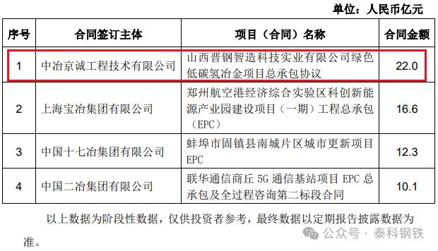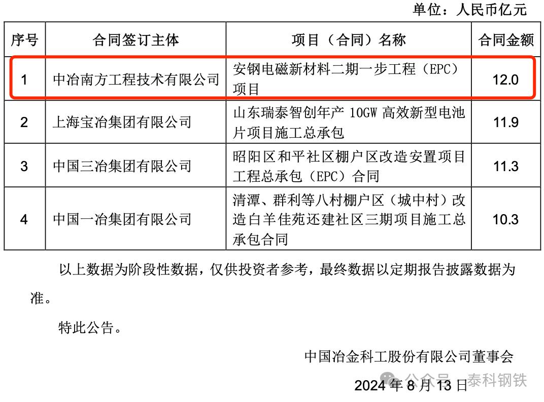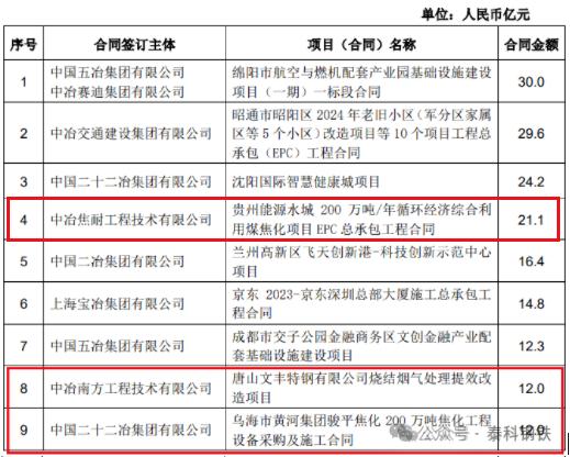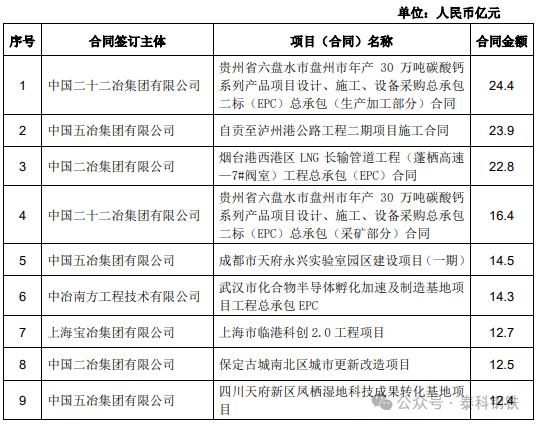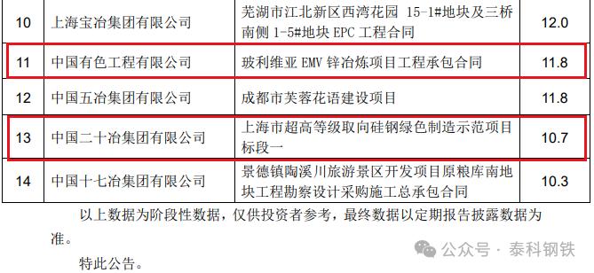 1、中冶南方工程技術有限公司簽唐山文豐特鋼有限公司燒結煙氣處理提效改造項目,合同額12億元;2、中冶焦耐工程技術有限公司簽貴州能源水城200萬噸/年循環(huán)經濟綜合利用煤焦化項目EPC總承包工程合同,合同額21.1億元;3、中國二十二冶集團有限公司簽烏海市黃河集團駿平焦化200萬噸焦化工程設備采購及施工合同,合同額12億元;4、中國有色工程有限公司簽玻利維亞EMV鋅冶煉項目工程承包合同 ,合同額11.8億元;5、中國二十冶集團有限公司簽上海市超高等級取向硅鋼綠色制造示范項目標段一,合同額10.7億元;6、中冶國際工程集團有限公司和中冶賽迪集團有限公司簽俄羅斯蘇洛亞姆釩鈦磁鐵礦及冶金綜合體項目,合同額108億元;7、中國五冶集團有限公司簽邢臺鋼鐵有限責任公司轉型升級搬遷 改造項目熔融還原煉鐵、煉鋼、軋鋼 主體及配套建設(一期)工程土建及安裝總承包施工工程合同,合同額25.0億元;8、中冶南方工程技術有限公司簽福建青拓不銹鋼中厚板項目,合同額13.3億元;9、中冶南方工程技術有限公司簽嘉峪關市酒鋼碳薄廠CSP改造主體工程合同,合同額13.1億元。10、中冶京誠工程技術有限公司簽山西晉鋼智造科技實業(yè)有限公司綠色低碳氫冶金項目總承包協(xié)議合同,合同額22.0億元。11、中國華冶科工集團有限公司簽大石河鉬礦整體管理項目承包合同,合同額126.1億元。12、中冶南方工程技術有限公司安鋼電磁新材料二期一步工程(EPC) 項目,合同額12.0億元。中國中冶7月新簽單筆合同額在人民幣10億元以上的重大工程承包合同項目: