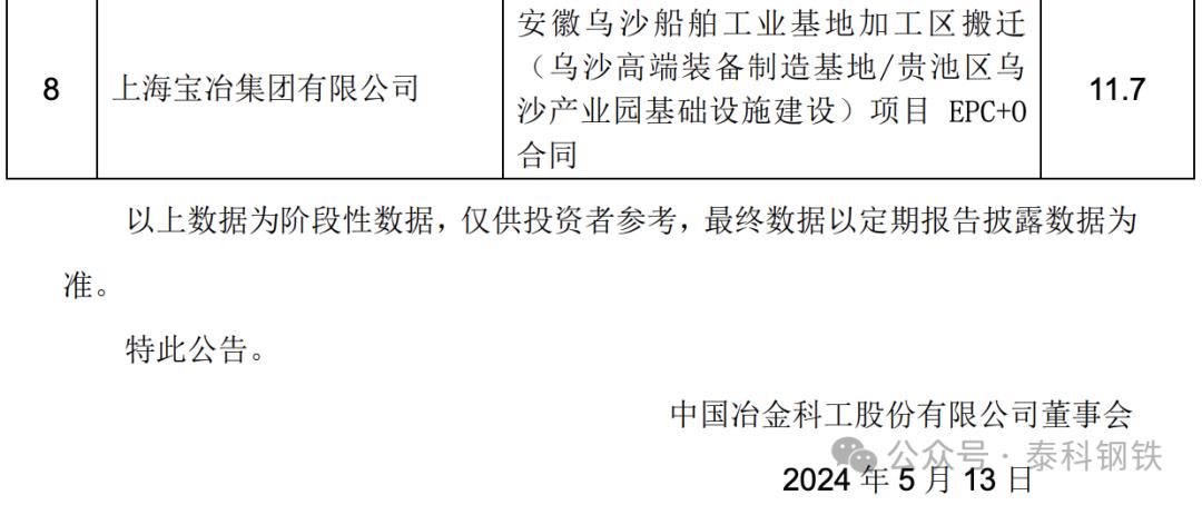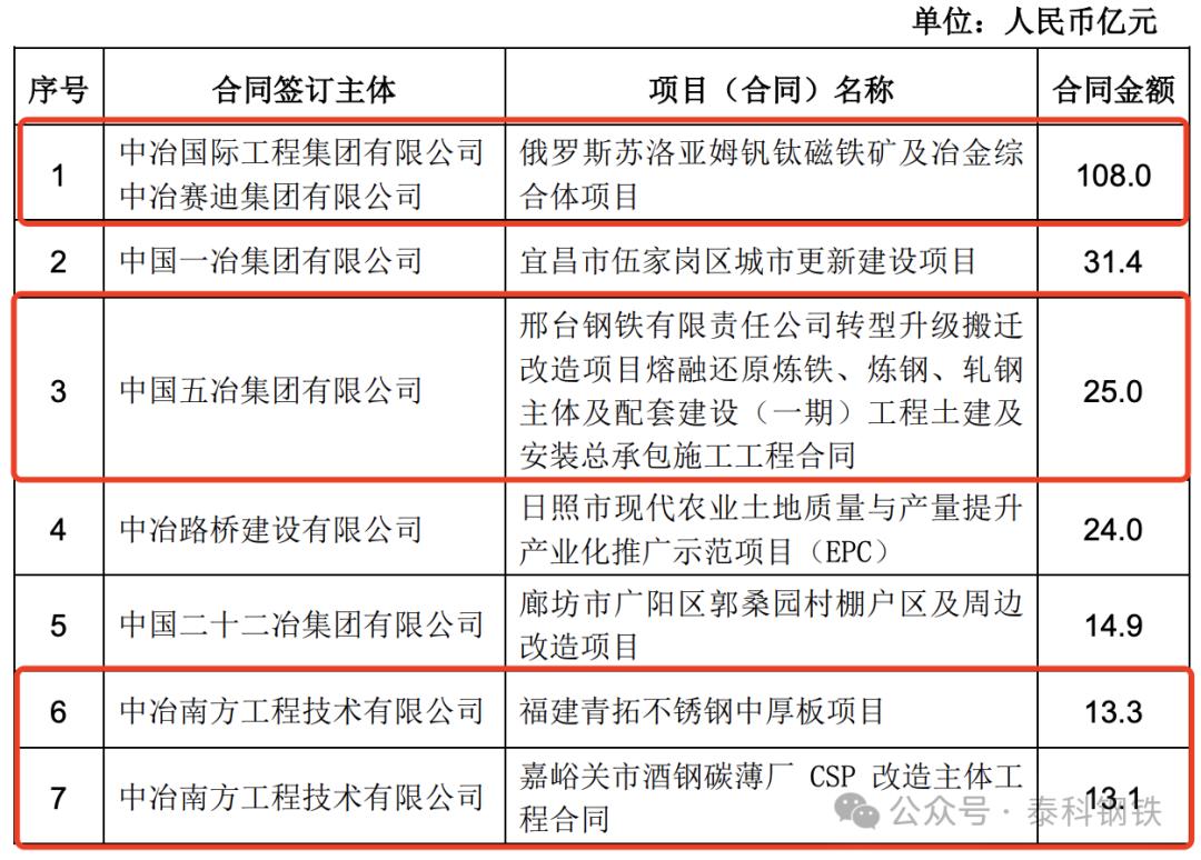 2024年8月,中國中冶發(fā)布2024年1-7月經營情況公告:中國中冶2024年1-7月新簽合同額人民幣7,504.4 億元,較上年同期降低 6.4%,其中新簽海外合同額人民幣443.9 億元,較上年同期增長 83.0%。其中中冶南方工程技術有限公司7月新簽安鋼電磁新材料二期一步工程(EPC) 項目,合同額12.0億元。1-7月單體最大的為中國華冶科工集團有限公司6月新簽大石河鉬礦整體管理項目承包合同,合同額高達126.1億元!中冶國際工程集團有限公司和中冶賽迪集團有限公司簽下俄羅斯蘇洛亞姆釩鈦磁鐵礦及冶金綜合體項目,合同額108億元。