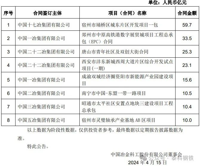 中國中冶4月新簽單筆合同額在人民幣10億元以上的重大工程承包合同項目: