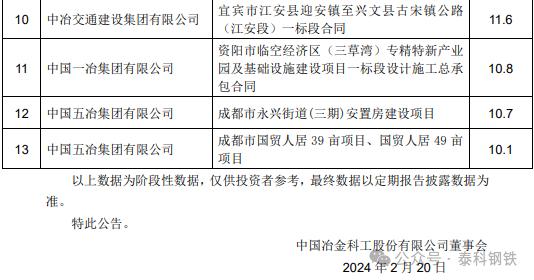 中國中冶2月新簽單筆合同額在人民幣10億元以上的重大工程承包合同項目: