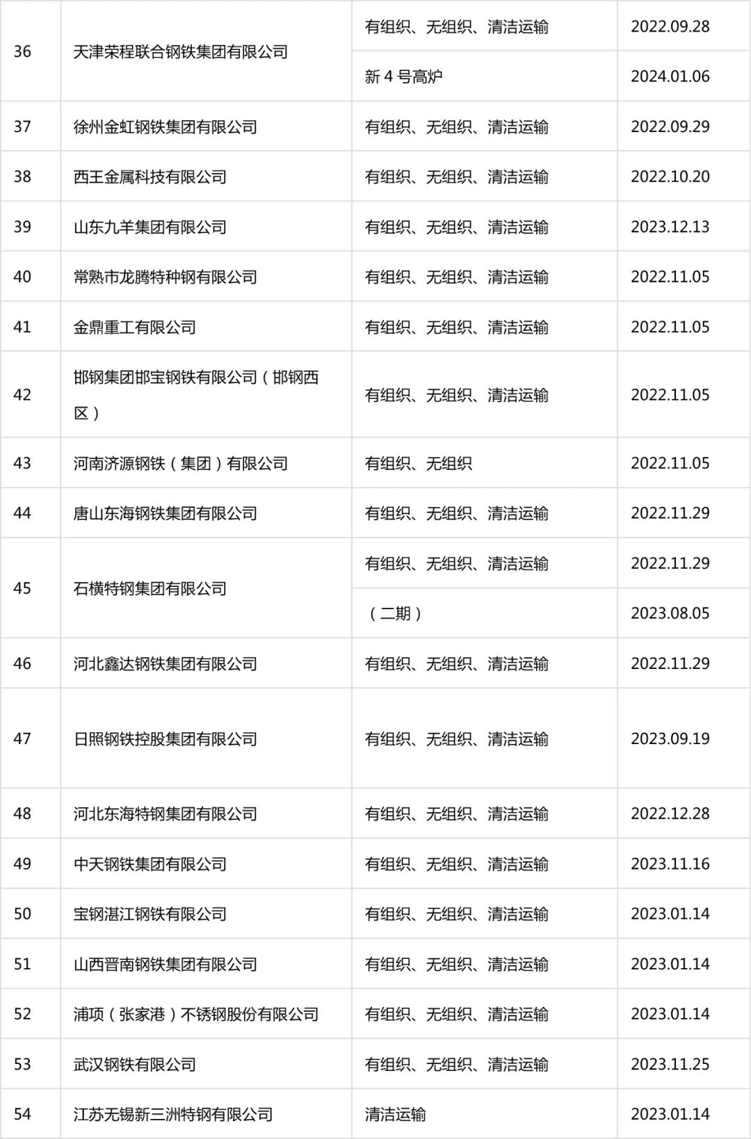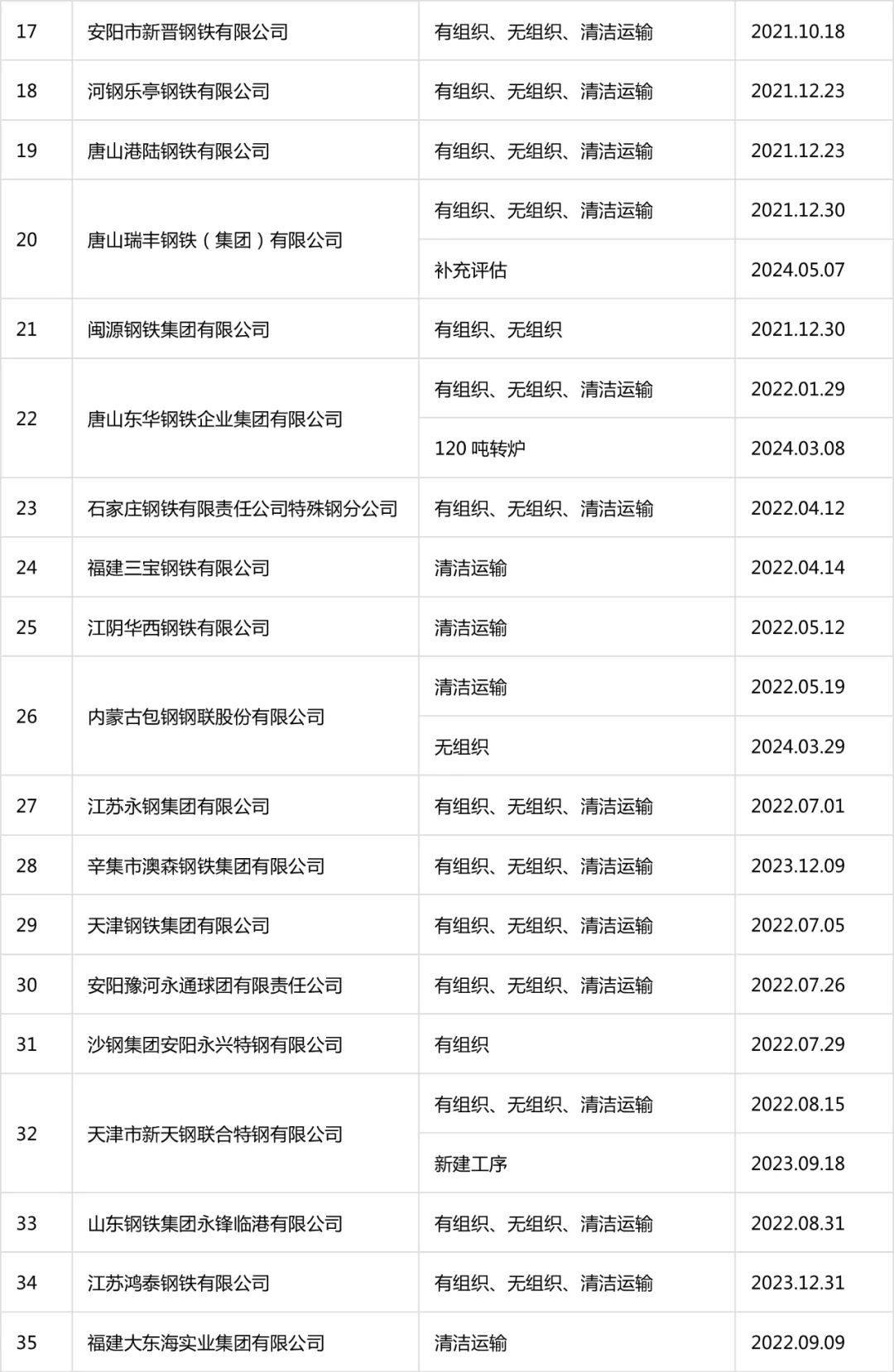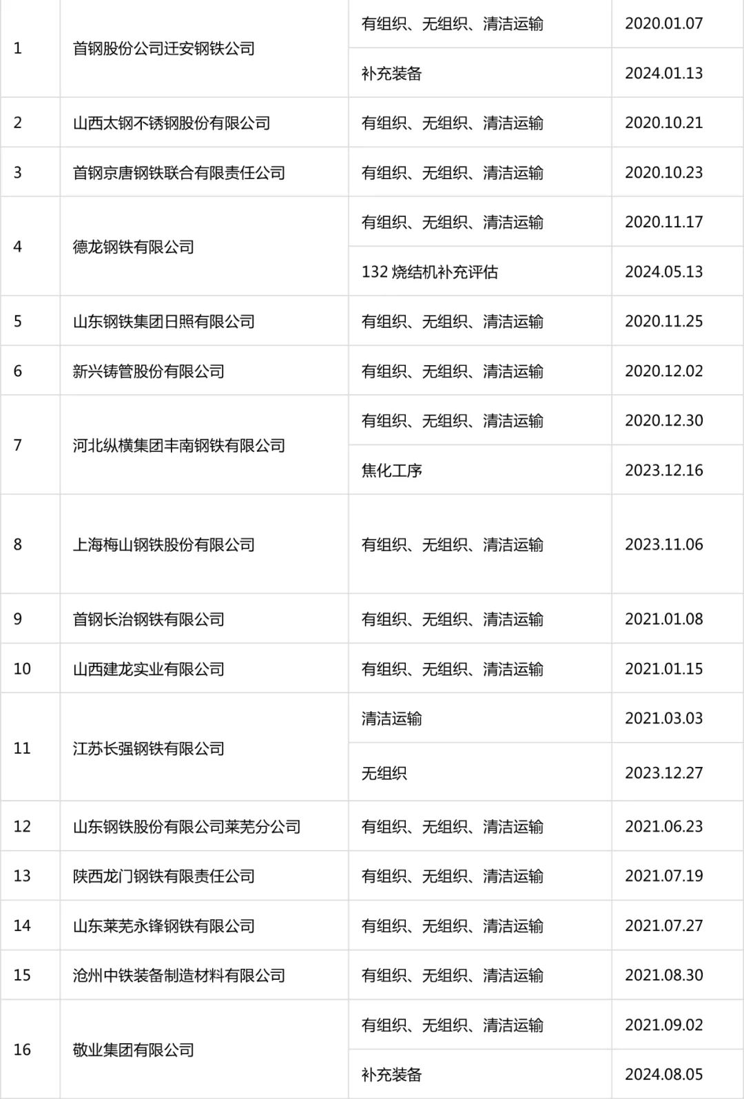 自2020年8月起,中國(guó)鋼鐵工業(yè)協(xié)會(huì)開展了鋼鐵企業(yè)超低排放改造和評(píng)估監(jiān)測(cè)進(jìn)展情況公示工作。截至目前,鋼協(xié)網(wǎng)站已公示企業(yè)名單及各企業(yè)公示內(nèi)容如下: