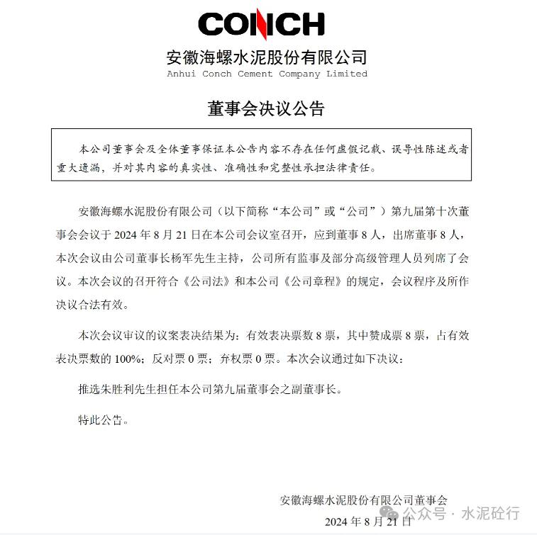 8月21日晚間,海螺水泥發(fā)布董事會(huì)決議公告,推選朱勝利先生擔(dān)任本公司第九屆董事會(huì)之副董事長。