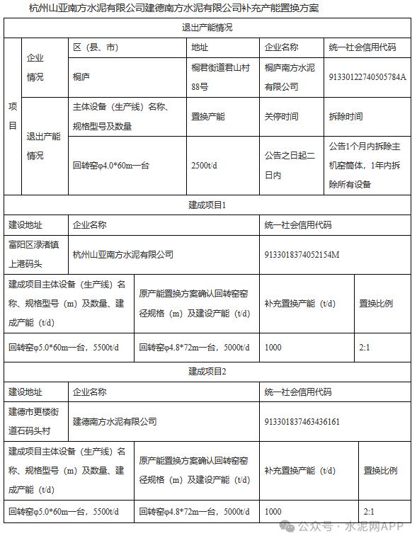 產(chǎn)能置換方案表中顯示,桐廬南方退出2500t/d產(chǎn)能,山亞南方、建德南方分別補(bǔ)充置換產(chǎn)能1000t/d。
