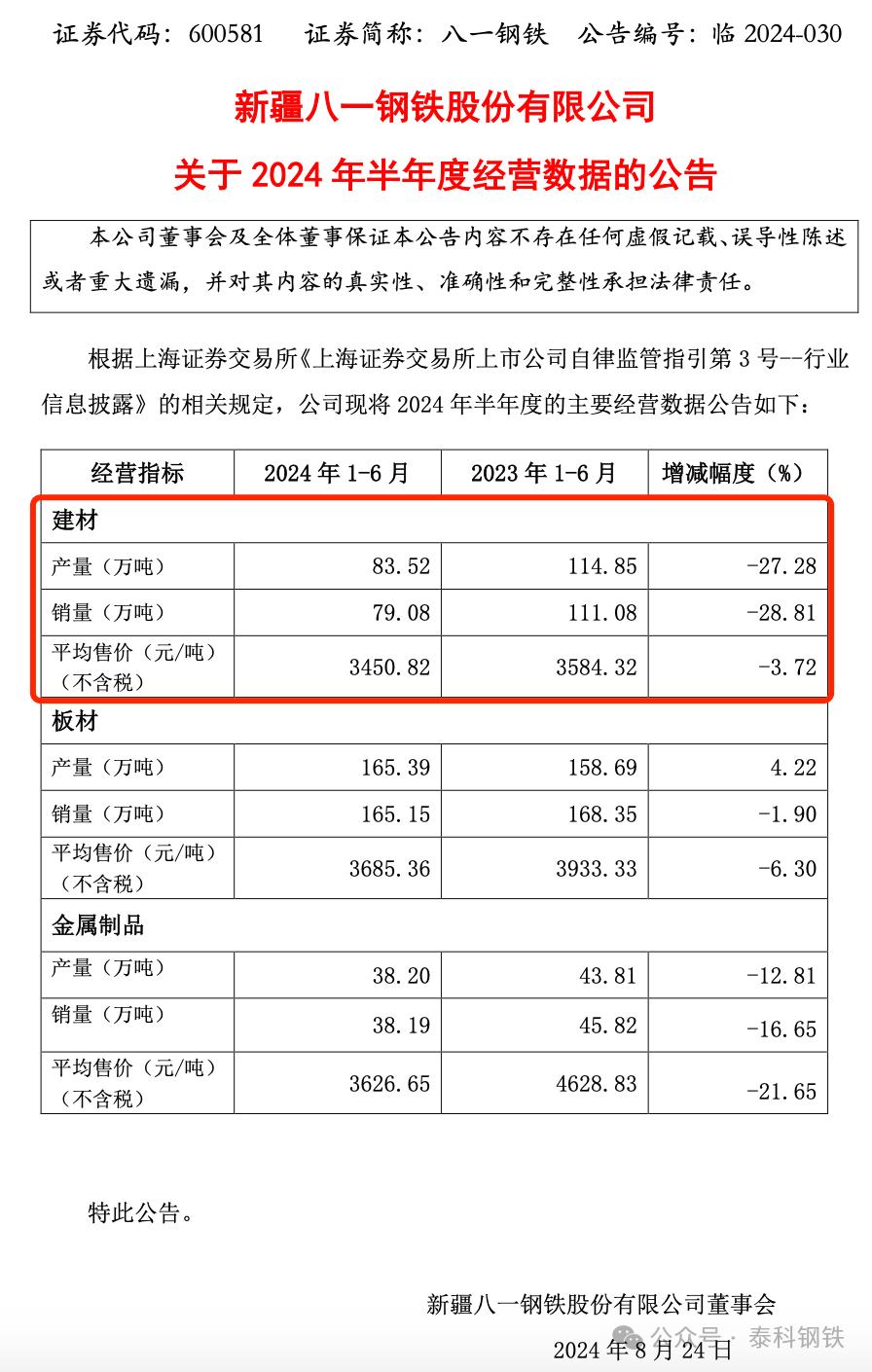 八一鋼鐵2023年實現(xiàn)營業(yè)收入229.71億元,同比下降0.32%,實現(xiàn)歸母凈利潤-11.63億元,虧損同比減少14.59%。報告稱,2024年上半年,公司仍堅持穩(wěn)中求進工作總基調(diào),加強對全國和新疆鋼鐵行業(yè)形勢研判,當(dāng)前鋼鐵行業(yè)競爭激烈,正從增量發(fā)展階段向存量優(yōu)化階段轉(zhuǎn)變,充足的產(chǎn)能與需求強度減弱之間的矛盾將更加突出,現(xiàn)處在減量調(diào)結(jié)構(gòu)周期,公司不斷加強上下游協(xié)作,保障產(chǎn)業(yè)鏈平穩(wěn)運行。 公司持續(xù)優(yōu)化內(nèi)部管理和運營機制,不斷提高生產(chǎn)效率和經(jīng)濟效益,推行精細化管理,加強 算賬經(jīng)營,增強產(chǎn)品核心競爭力,積極應(yīng)對市場風(fēng)險和挑戰(zhàn),推進公司高質(zhì)量發(fā)展。 報告期公司實現(xiàn)鐵產(chǎn)量 234萬噸、鋼產(chǎn)量267萬噸、商品材產(chǎn)量 249 萬噸,同比分別減少 30萬噸、21萬噸、25萬噸。實現(xiàn)營業(yè)收入 93.63 億元,同比降幅 16.28%,營業(yè)成本 95.63億元,同比降幅15.38%,累積虧損7.2 億元,同比減虧0.5億。