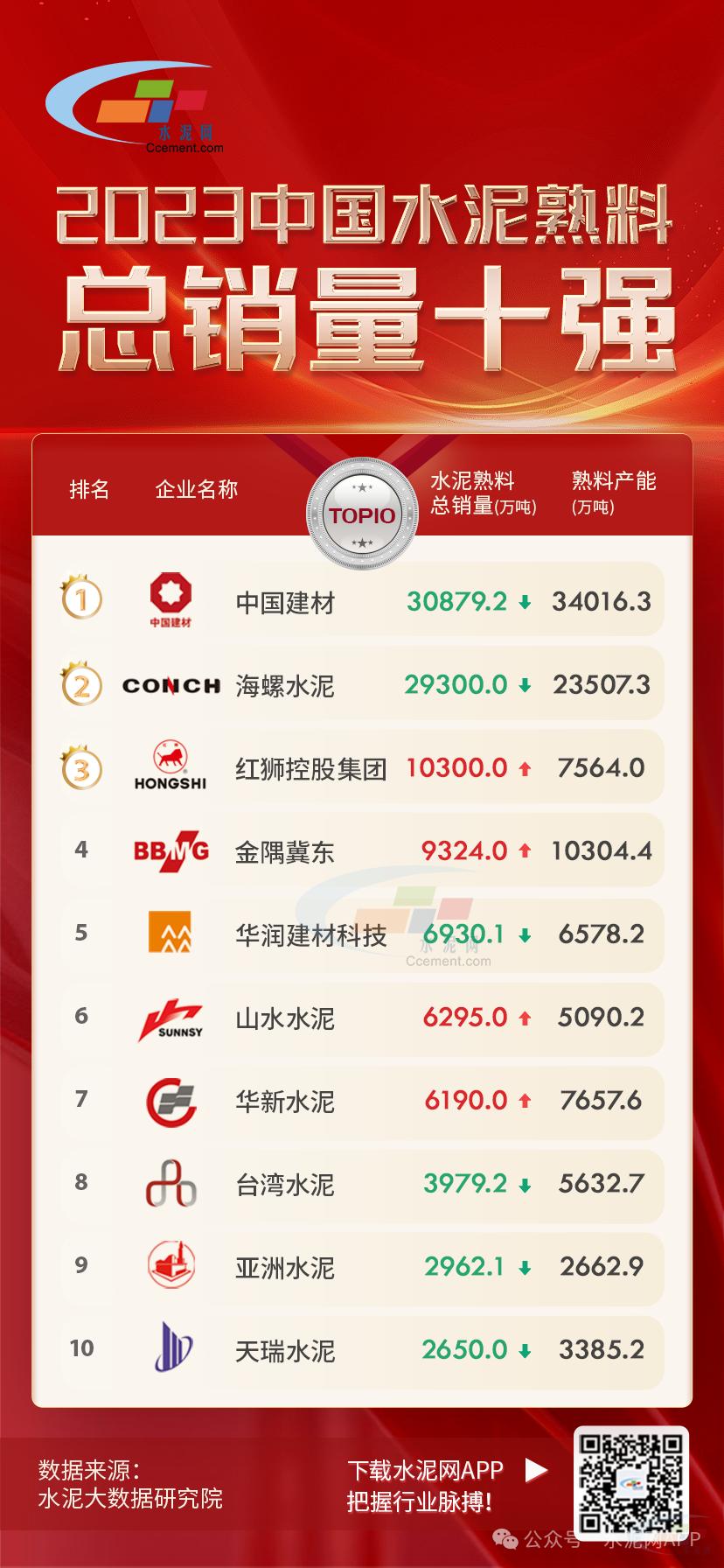 日前,中國水泥網發(fā)布2023年中國水泥熟料總銷量TOP10排行榜。