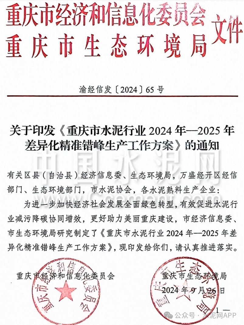 日前,重慶市經(jīng)信委和生態(tài)環(huán)境局聯(lián)合發(fā)布《重慶市水泥行業(yè)2024年-2025年差異化精準錯峰生產(chǎn)工作方案》的通知。