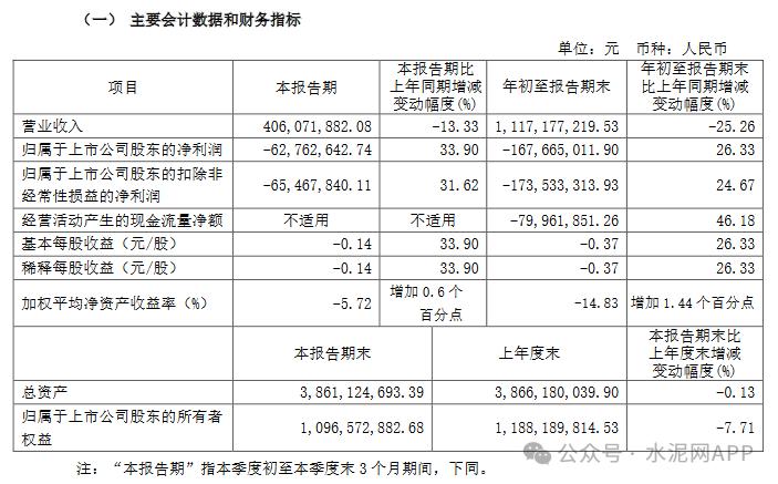 10月23日晚間,福建水泥披露2024年第三季度報告,報告期公司實現(xiàn)營收11.17億元,同比下降25.26%;歸母凈利潤虧損1.68億元,虧損同比縮小26.33%。