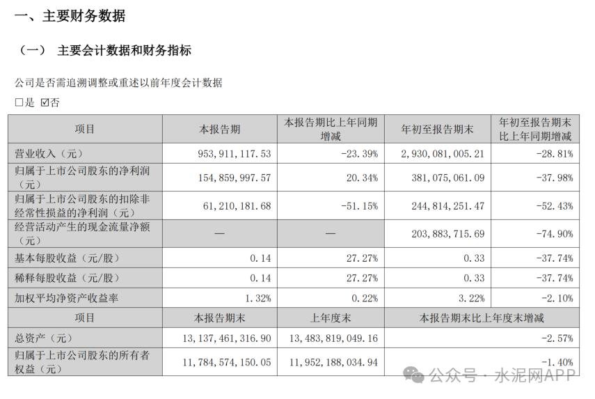塔牌集團(tuán)10月24日晚間發(fā)布三季度業(yè)績公告稱,2024年前三季度營收約29.3億元,同比減少28.81%;歸屬于上市公司股東的凈利潤約3.81億元,同比減少37.98%;基本每股收益0.33元,同比減少37.74%。