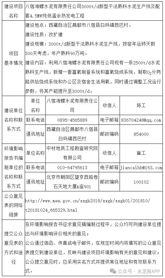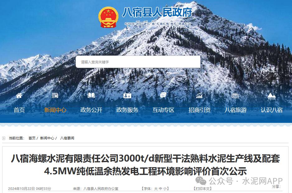 日前,西藏八宿縣人民政府網(wǎng)站發(fā)布《八宿海螺水泥有限責任公司3000t/d新型干法熟料水泥生產(chǎn)線及配套4.5MW純低溫余熱發(fā)電工程環(huán)境影響評價首次公示》。