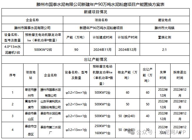 10月28日,山東省工信廳發(fā)布“關(guān)于滕州市國泰水泥產(chǎn)能置換情況的公示”稱,滕州市國泰水泥有限公司擬新建一臺φ4.0×13m水泥磨機,年產(chǎn)能90萬噸,計劃2024年12月投產(chǎn),置換比例2:1。滕州市國泰水泥有限公司等四家水泥企業(yè)共計出讓產(chǎn)能180萬噸用于本項目,于2022年12月拆除退出。