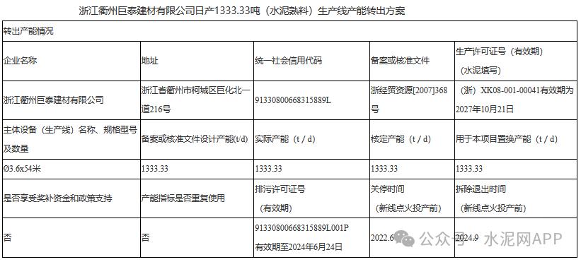 根據(jù)公示,浙江衢州巨泰建材1333.33t/d水泥熟料生產(chǎn)線產(chǎn)能轉(zhuǎn)出,用于補充貴州江葛水泥4000t/d熟料生產(chǎn)線(置換補充1000t/d)、雞西賽龍水泥2500t/d熟料生產(chǎn)線(置換補充333.33t/d)產(chǎn)能。