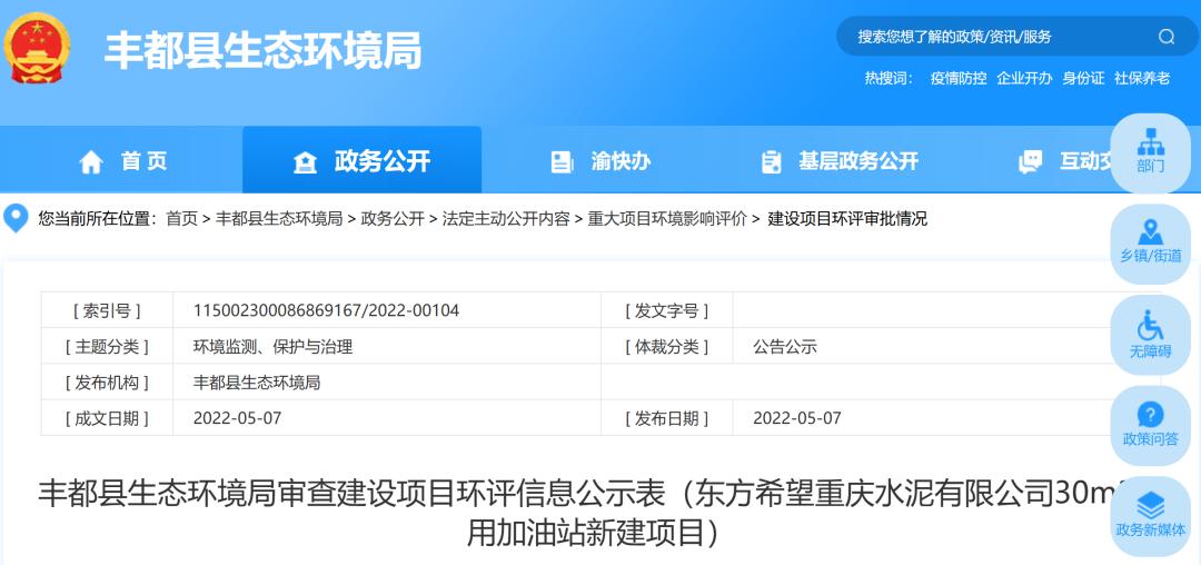 近日,重慶市豐都縣生態(tài)環(huán)境局受理了東方希望重慶水泥有限公司骨料生產(chǎn)線改造項目建設項目環(huán)評信息。