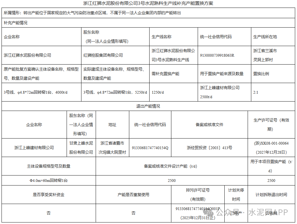 置換方案顯示,浙江紅獅水泥股份有限公司3號線需補(bǔ)充置換產(chǎn)能1250t/d,生產(chǎn)線產(chǎn)能由補(bǔ)充前4000t/d到補(bǔ)充后5250t/d。退出的2500t/d產(chǎn)能來自浙江上峰建材有限公司,置換比例2:1。