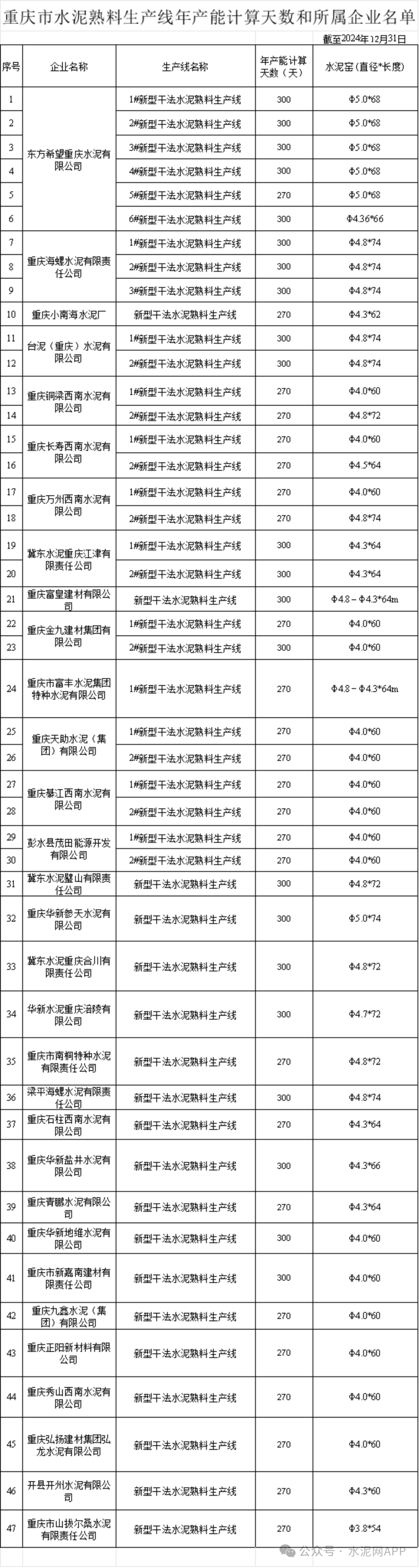 4月24日,重慶市經(jīng)濟(jì)和信息化委員會(huì)發(fā)布關(guān)于重慶市水泥熟料生產(chǎn)線年產(chǎn)能計(jì)算天數(shù)和所屬企業(yè)名單的公示。