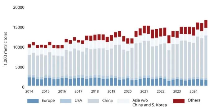 世界不銹鋼協(xié)會(huì)發(fā)布的數(shù)據(jù)表明,2024年,全球不銹鋼粗鋼產(chǎn)量為6260萬(wàn)噸,同比提高7%。