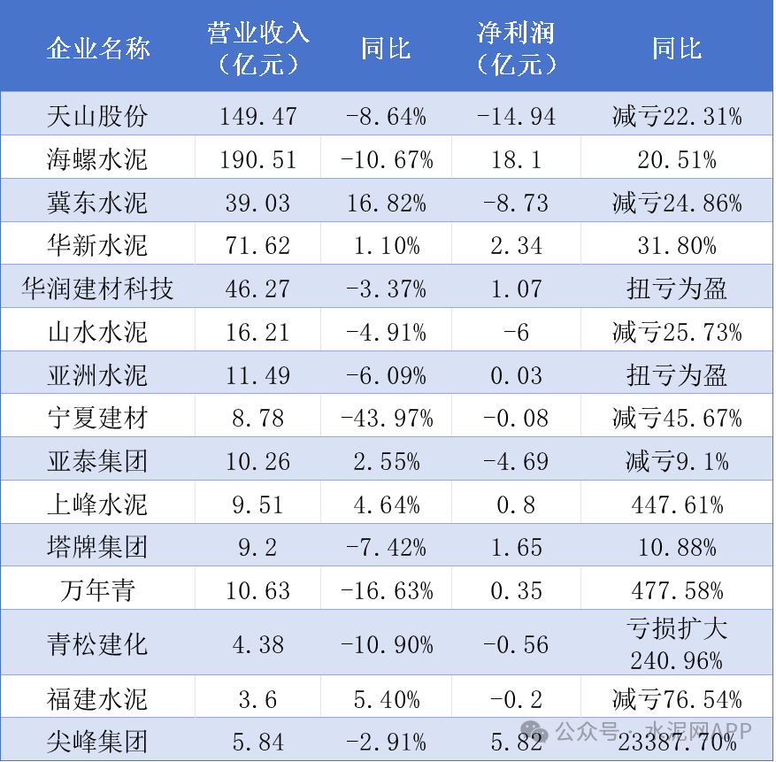 近日,水泥上市公司陸續(xù)披露2025年一季度業(yè)績(jī),除青松建化,其余水泥企業(yè)凈利潤(rùn)均出現(xiàn)增長(zhǎng),詳情見下表: