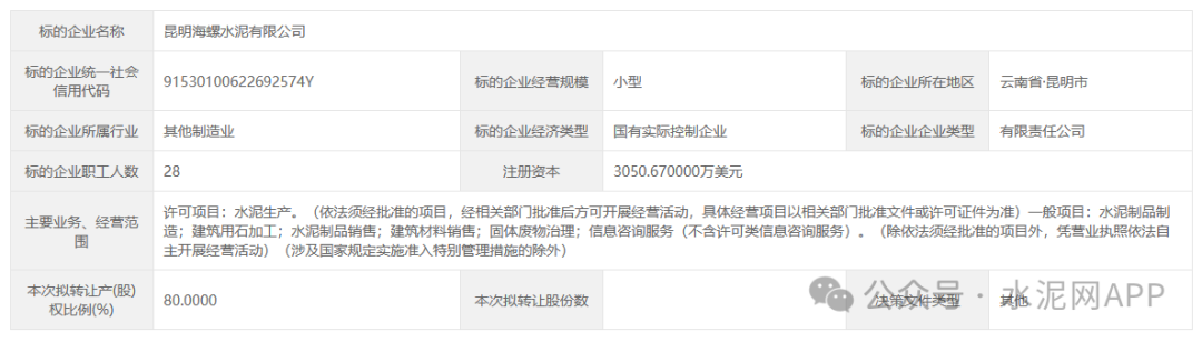 據(jù)某產(chǎn)權(quán)交易平臺(tái)顯示,近日昆明海螺水泥有限公司80%股權(quán)及19,503萬元債權(quán)轉(zhuǎn)讓預(yù)公告發(fā)布。該企業(yè)由海螺水泥持股80%,德宏發(fā)展持股20%。