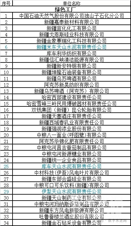 根據(jù)公示,新疆米東天山水泥有限責(zé)任公司、庫車天山水泥有限責(zé)任公司、伊犁天山水泥有限責(zé)任公司入選綠色工廠名單。